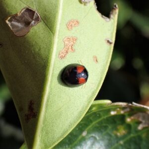 ヘリグロテントウノミハムシは、 黒いはねに2個の赤い紋がありテントウムシにそっくり!幼虫も成虫も葉を食べるので、 葉は食べあとだらけになります。