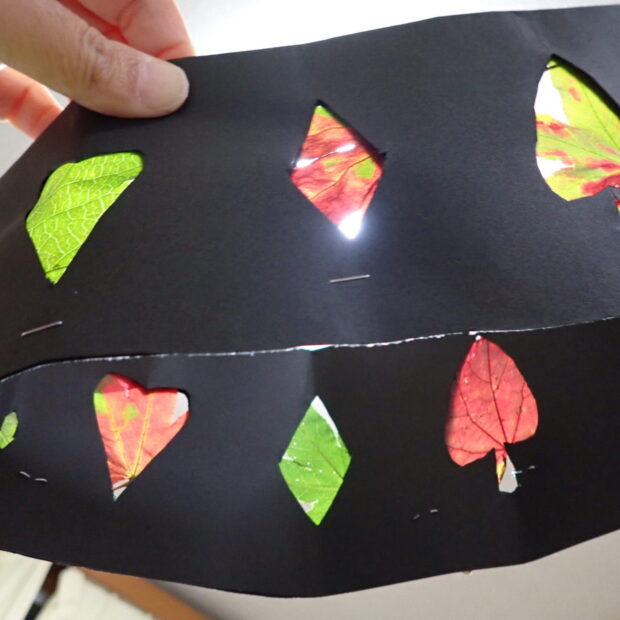 黒い紙(A3ぐらい)を2つに縦長に切って使います。 縦に2つに折って二重にし、 間に葉っぱをはさめるようにします。 窓のように穴をあけたいところは、 紙を少し折ってから線対称の形(ハート、 スペード、 ダイヤなど)を切り抜きます。 穴が開いた場所に葉を置き、 紙の間に挟んでからホッチキスで止めます。 皮膚にホッチキスの針先があたらないように、 外側に針先が出るように止めてください。
