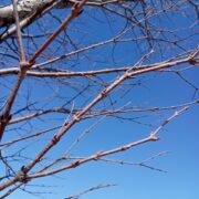 赤みがあって先のとがった冬芽で、 枝の両側に2個ずつ出ています。 葉痕の維管束痕は3つで、 烏帽子をかぶった平安貴族のようなお顔に見えます。 枝によって役割分担があり、 枝や芽のつき方が特徴的です。