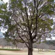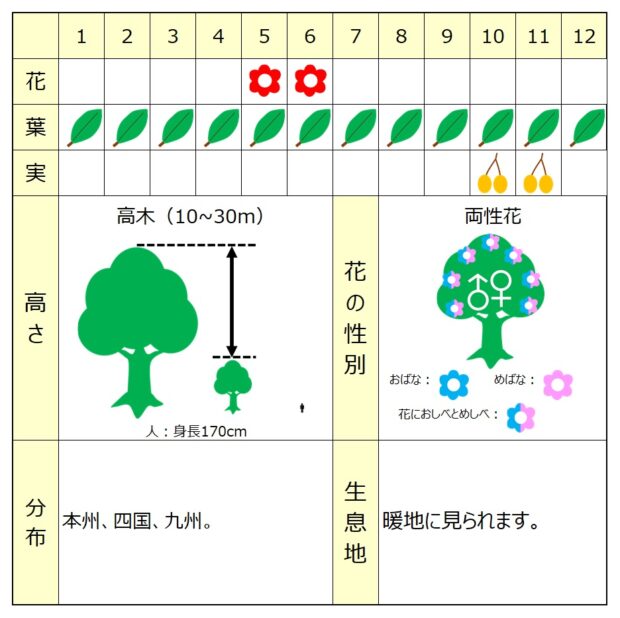 クスノキは、 日本で一番太くなる木です。 日本の巨木1位は、 鹿児島県の「蒲生の大楠(かもうのおおぐす)」と呼ばれるクスノキで、 幹回り24m以上と言われています。 全国の神社にはクスノキの巨樹が多く生えています。 葉は、 爽やかな香りがします。