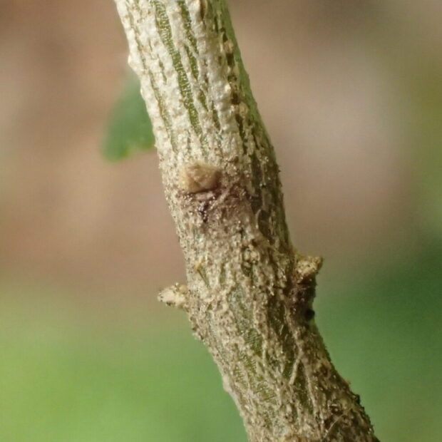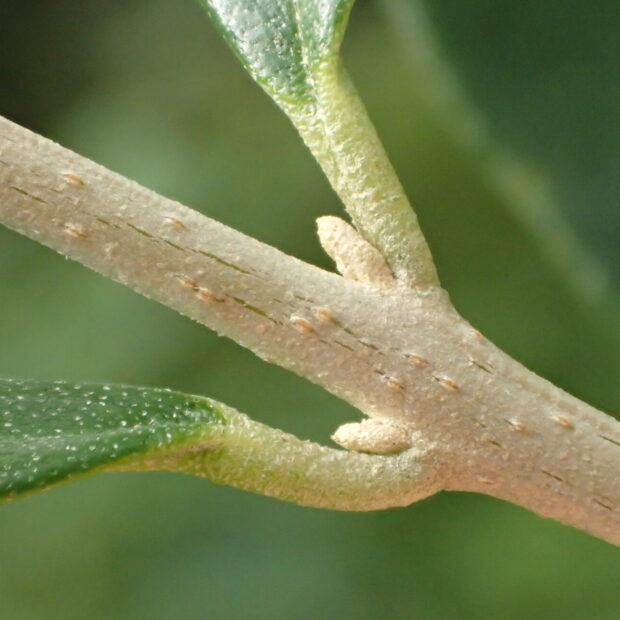 枝先、 葉のつけ根に、 白っぽいホワホワの毛でおおわれた小さな芽がつきます。 そのまま伸びて葉になります。