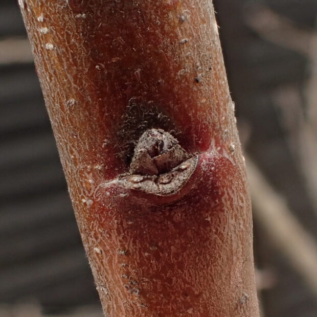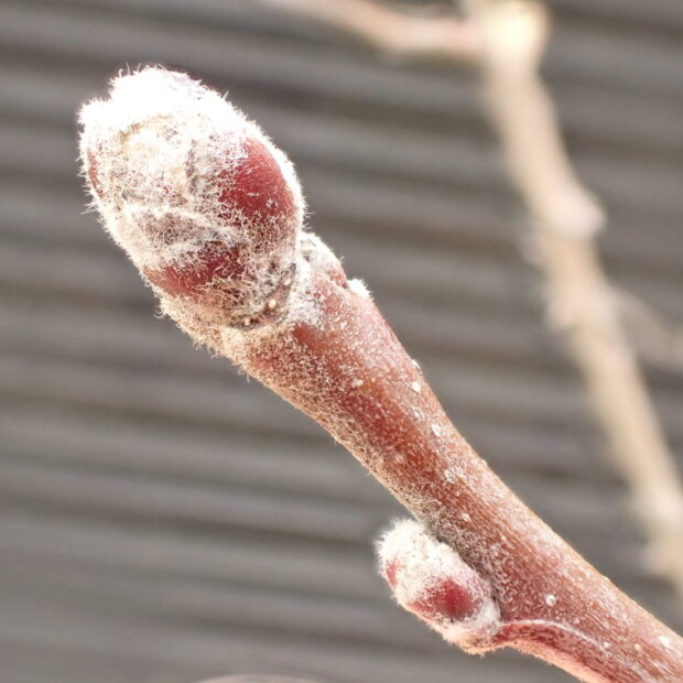 ぷっくりとしていて赤みのある褐色の芽には、 白い毛がたくさんあります。 葉痕の維管束痕は3つで、 素朴な感じのお顔に見えます。