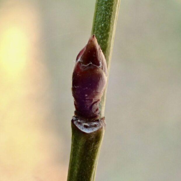 赤みのある褐色の芽鱗に包まれています。 春になって芽がふくらみ始めると黄緑色の葉が見えてきて、 2色のコントラストがきれいです。 葉痕の維管束痕は3つで、 お顔に見えます。