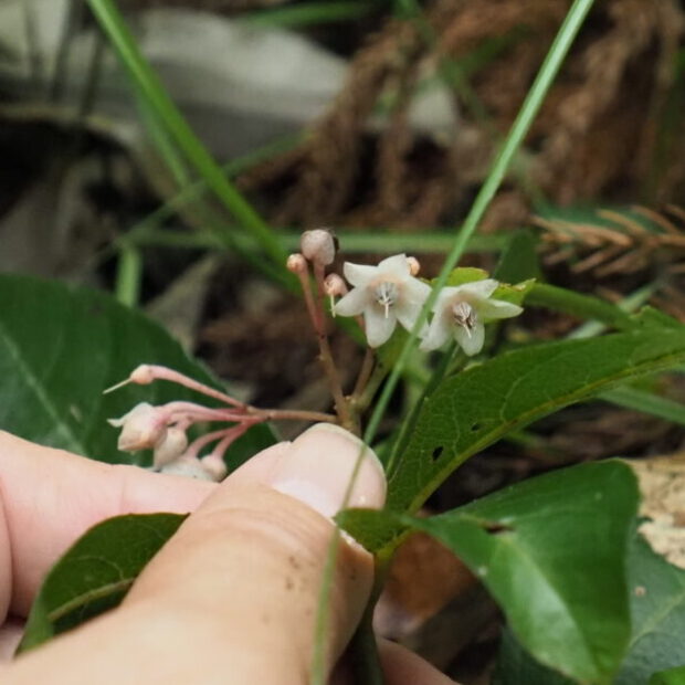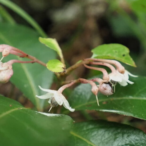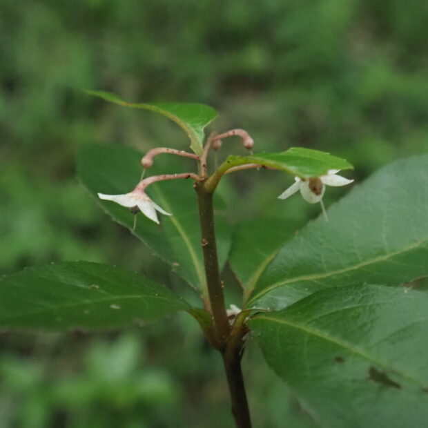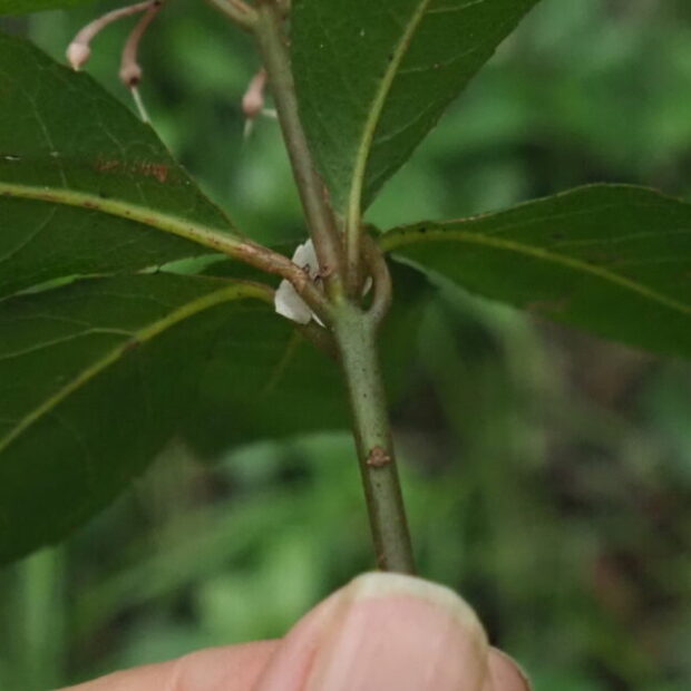 夏、 葉の付け根に白色の小さな花が下向きに咲きます。