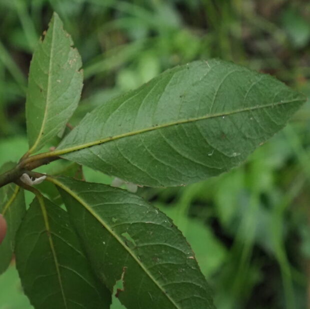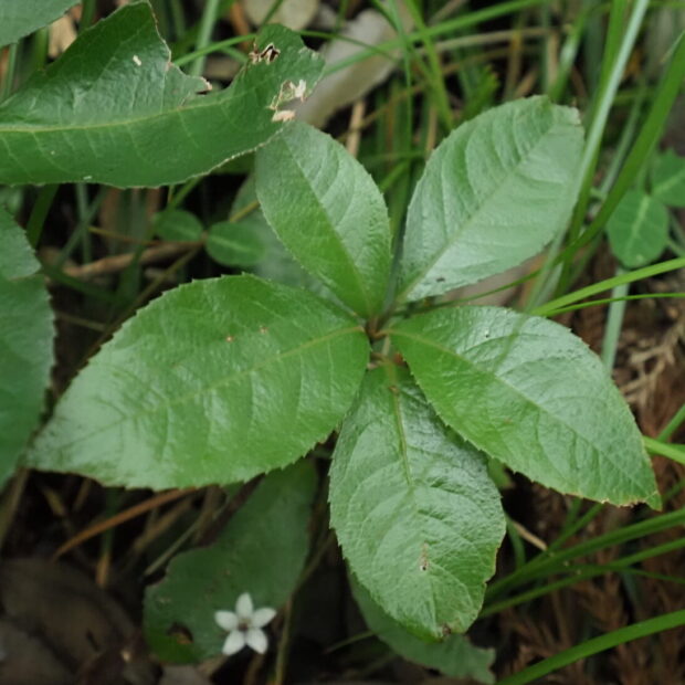 長楕円形または狭楕円形の葉っぱです。 互生で茎の上部に3~5枚が輪生状にまとまって付きます。