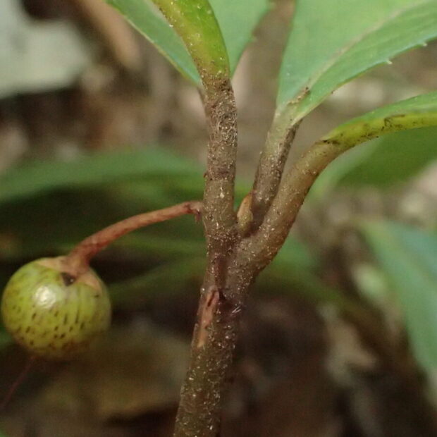 地上茎には小さな粒状の毛があり、 匍匐茎は暗褐色の樹皮をしています。