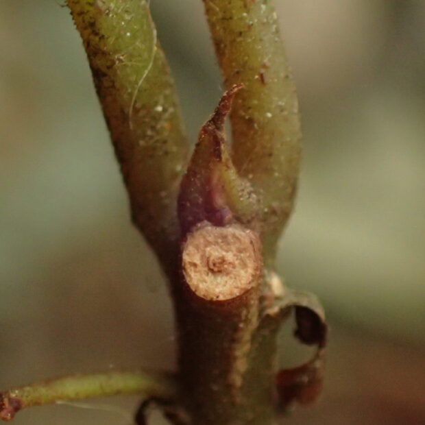 幹・枝と同じような色をした、 ツンととがった小さな芽です。 葉痕は丸い形で、 維管束痕は1つです。