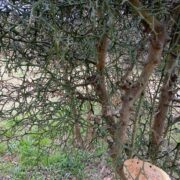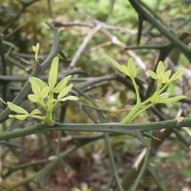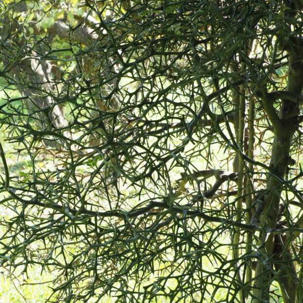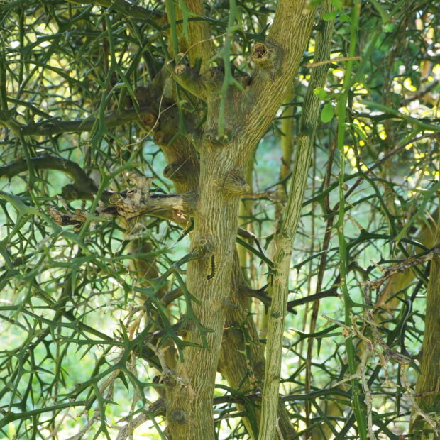 コンパクトに枝葉をつけ、 高さ3mくらいになります。 太いトゲが5cmくらいになるものもあり、 トゲも枝のようになって、 自ら絡まり合うかのようにまとまって見えます。
