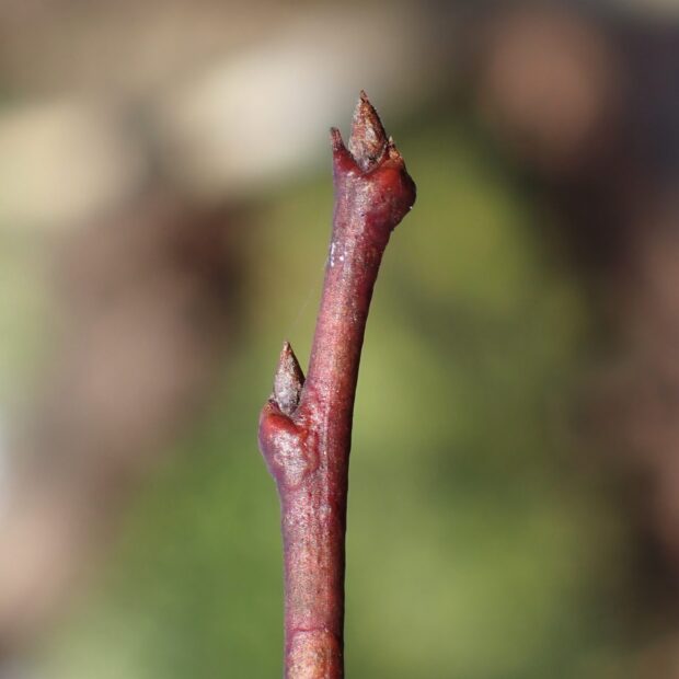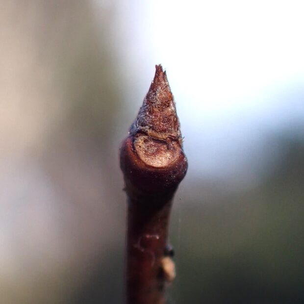 冬芽も枝と同じような濃い赤茶色です。 枝先の芽は葉芽で、 先がとがった円錐形です。 葉痕の維管束痕は3つで、 幼い感じのお顔に見えます。