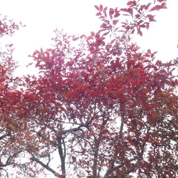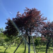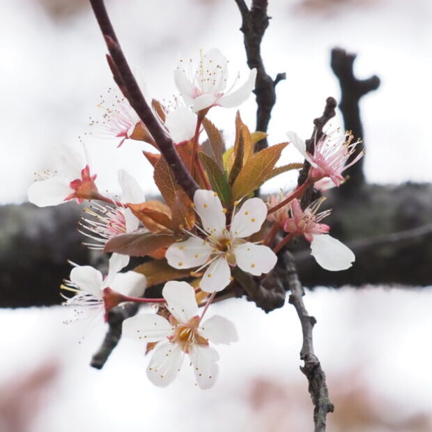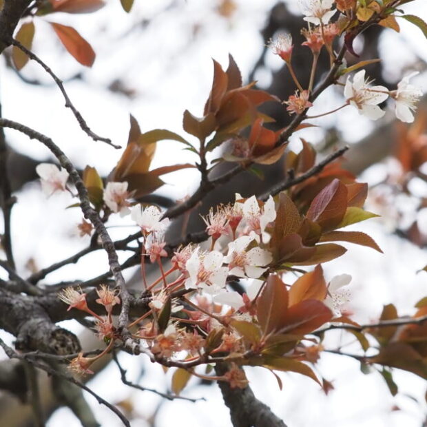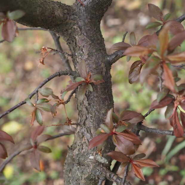 赤紫色の葉のスモモで、 西アジア、 コーカサスに自生するミロバランスモモの栽培品種です。 サクランボほどの丸い実が夏に黄色~赤色に熟しますが、 酸っぱいので生では食べられません。