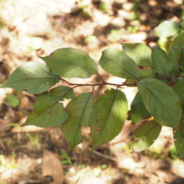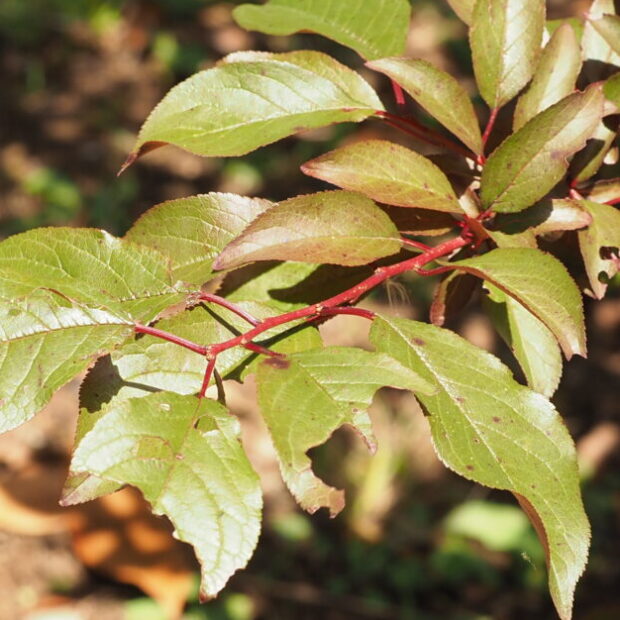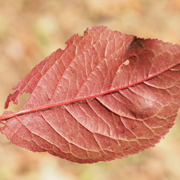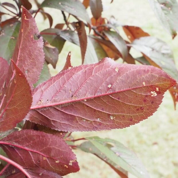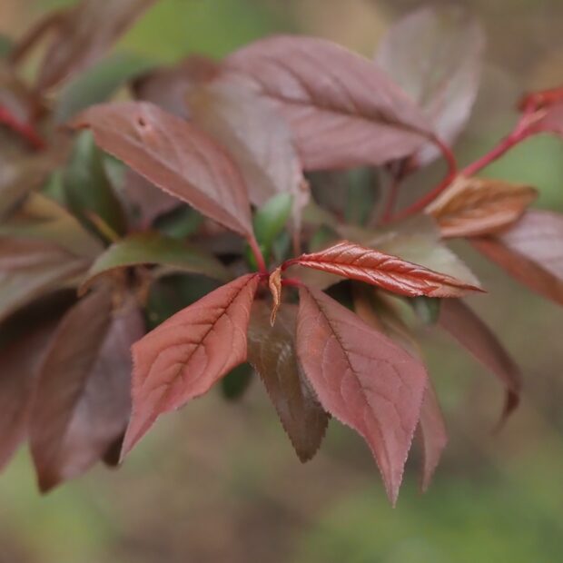 赤紫色の葉っぱです。 長さ4~10㎝でスモモの葉に似ていますがやや広く、 裏は葉脈沿いに毛が多いです。