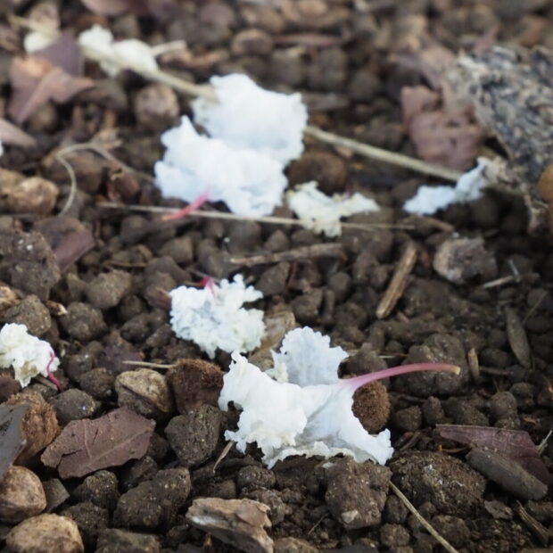 • 散った白い花びらは、 雪のよう。