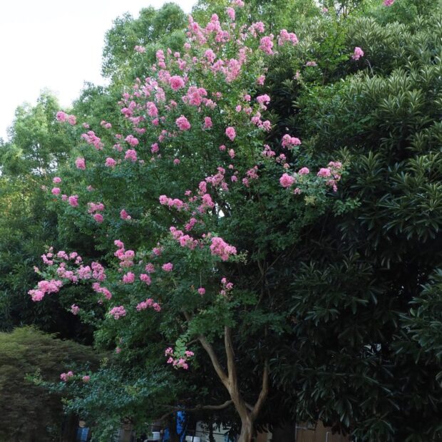 幹がサルが滑るくらい滑らかなので「サルスベリ」と名前につきました。 赤やピンクの美しい花が100日も咲くということで「百日紅」(ヒャクジツコウ)と呼ばれたり漢字で書いたりされます。