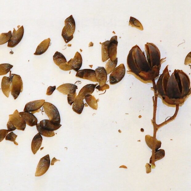 黒っぽい丸い実がなります。 実が割れると中から羽のついた種がたくさん出てきます。