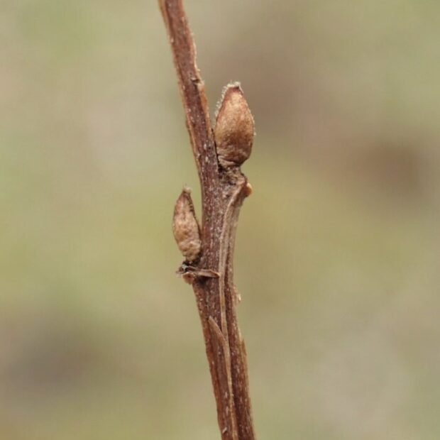 水滴型の小さな芽です。 細い枝の芽の横には、 枝からクイっと飛び出し、 下に向かって筋のような出っ張りがあります。