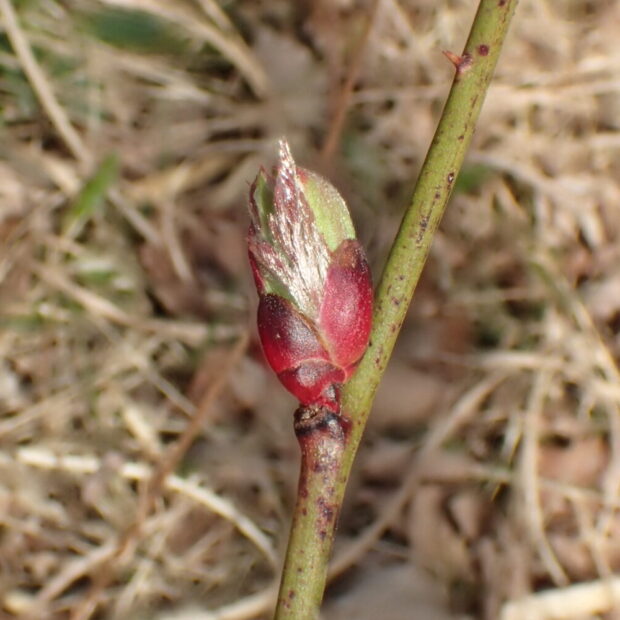 赤くて長い水滴型の冬芽、 黄緑色の枝とまっすぐなトゲがモミジイチゴの目印です。 枝に陽が当たるところは赤くなります。 葉痕はとても小さいですが、 維管束痕は3つあり、 お顔が見えることがあります。