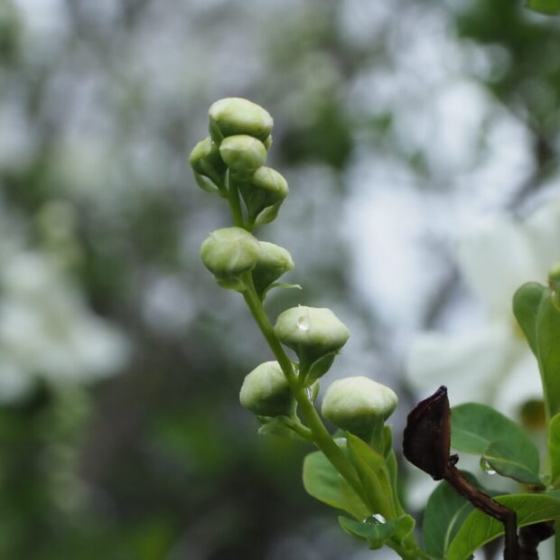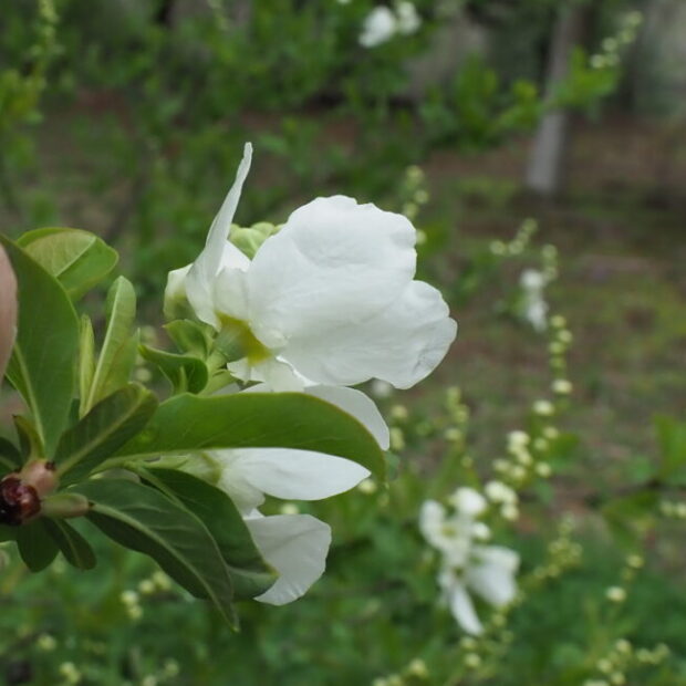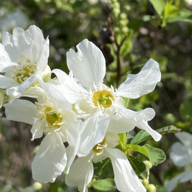 白くて丸い花弁が5枚、 花弁の間からのぞく小さな萼(がく)も白い色です。 枝先にふさのようになってつきます。