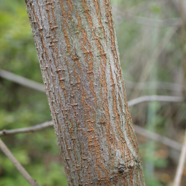 幹は縦に粗い筋のある褐色です。 若い幹は白っぽく、 縦の筋があります。 若い枝は茶色です。