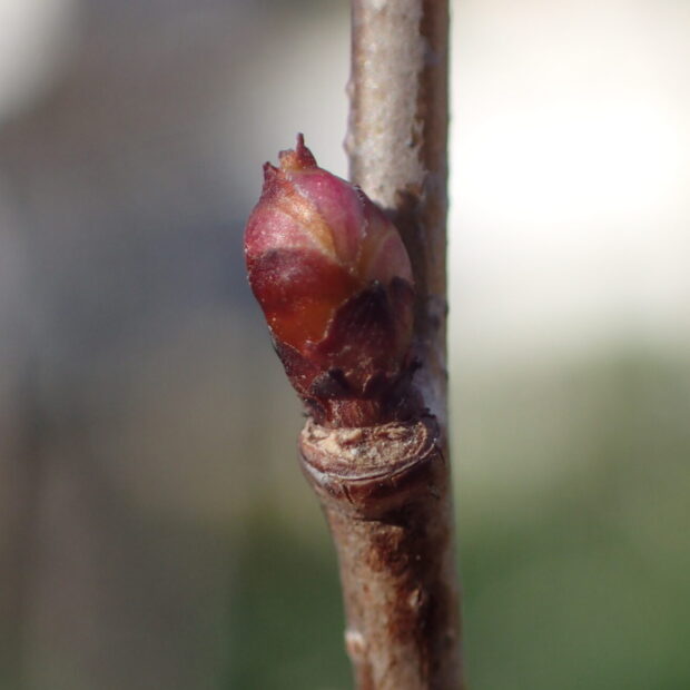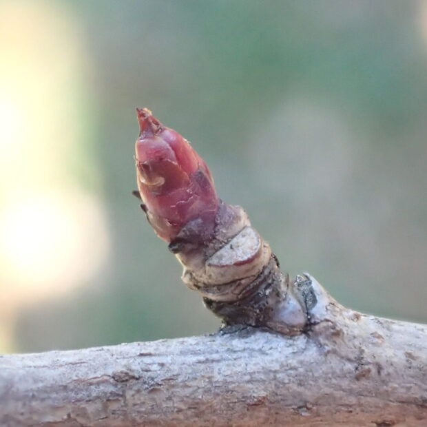 先がピュンととがり、 つやがあって紅色がかった芽鱗に包まれた冬芽です。 半円形の葉痕には維管束痕が3つ、 上の方に並んでいて、 お顔に見えます。