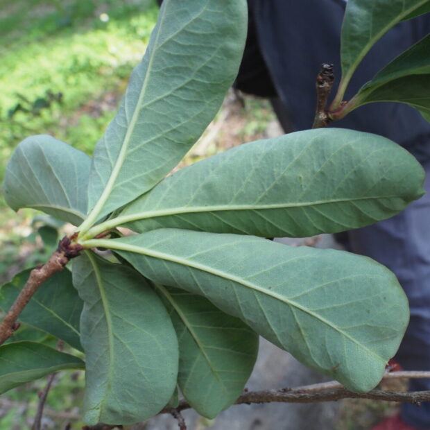 ほぼ楕円形ですが、 真ん中から先の方が少し幅が広い形をしています。 葉の縁にギザギザが全くないものと、 葉先に少しだけギザギザがあるものがあります。