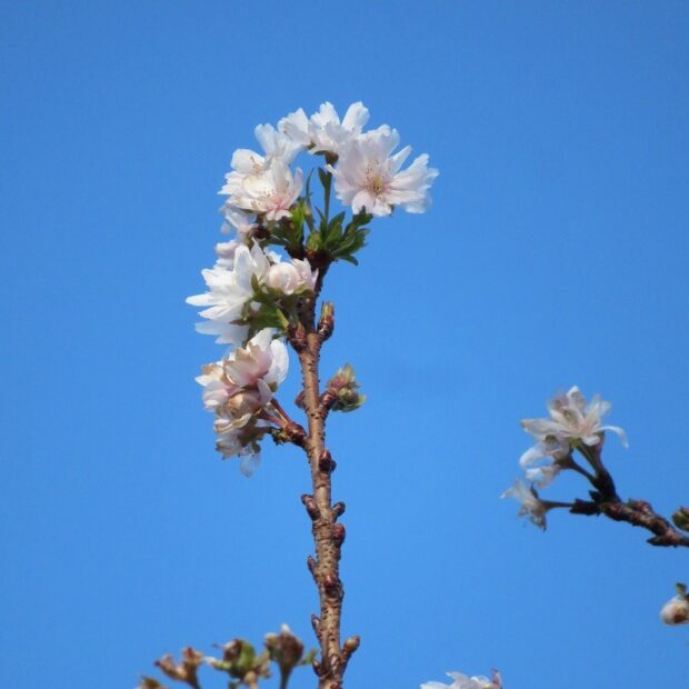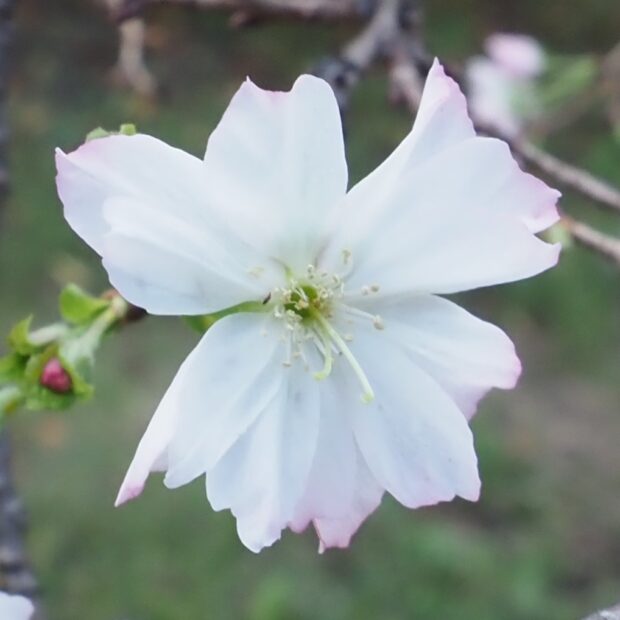 10月から咲き始めるためジュウガツザクラと呼ばれるサクラです。 野生種のマメザクラとエドヒガンの交雑種でコヒガンと名付けられた品種のひとつです。 秋と春の二季咲性の代表種でもあります。 蕾は紅色、 開花後は白色、 やがて淡い紅色になり散ります。 秋咲く花より春の花のほうが大きく色も濃いですが他の桜より花数が少ないために目立ちません。