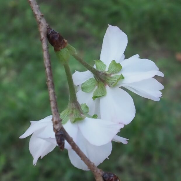 マメザクラの影響であまり大きくならず、 枝も細く葉も小さいですが、 秋からまばらに長く咲く花が顔の高さで咲くので、 間近で見られる性質が好まれます。