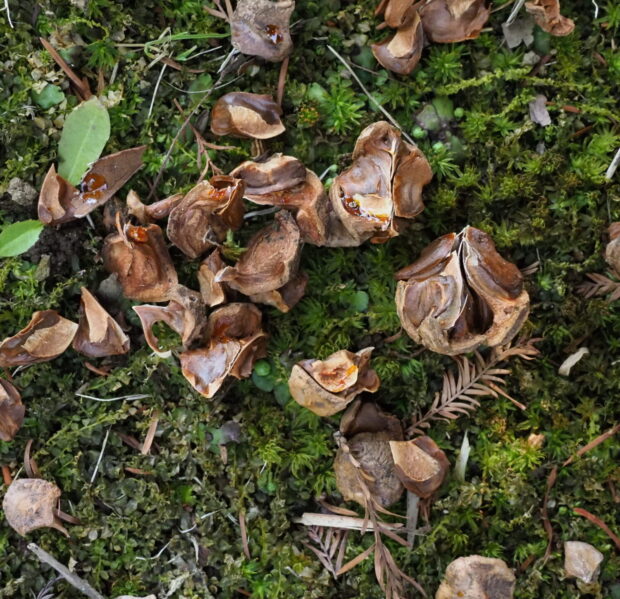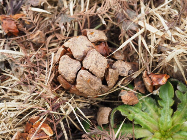 サッカーボールのような形の実(球果)が出来ます。 熟すと落ちて割れて中から種が出てきます。