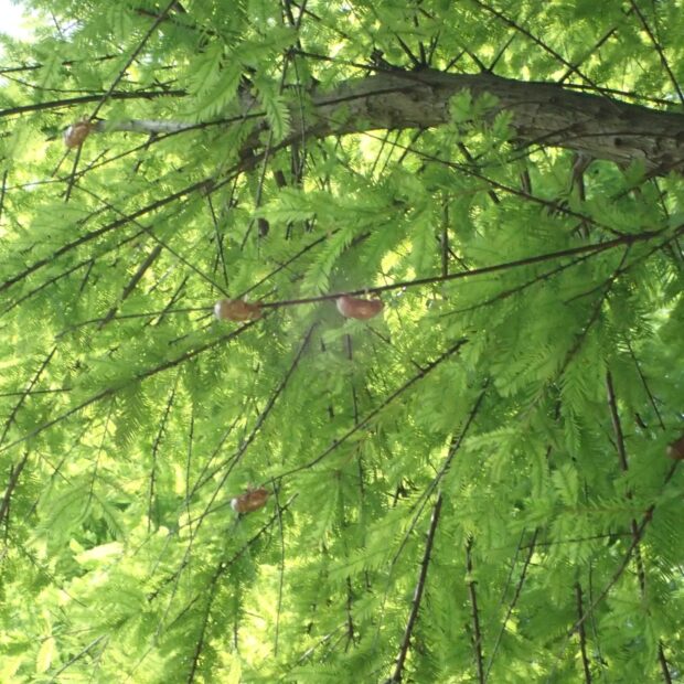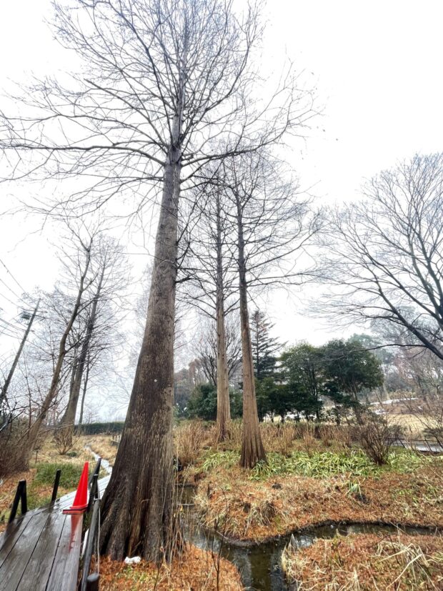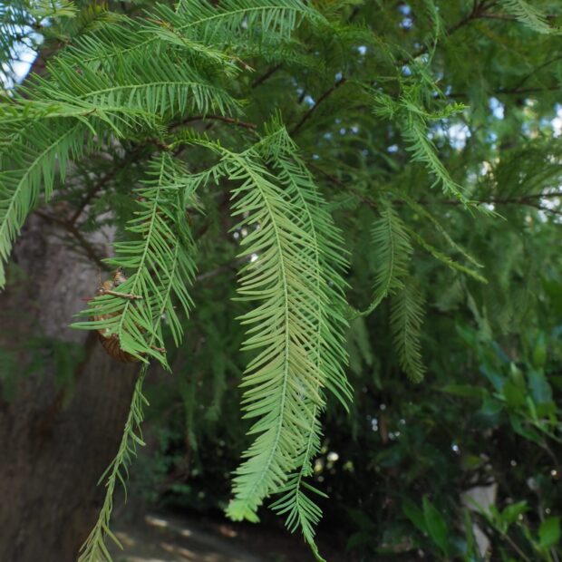 メタセコイアと似ていますが、 葉が交互につくので見分けられます。 秋には茶色く紅葉して落葉します。