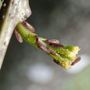 トモエガの仲間(カキバトモエ、 ハグルマトモエ、 オスグロトモエなど)の大きな幼虫が葉や幹にいることがあります。