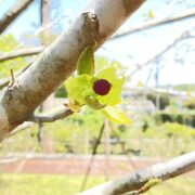 先がとがり、 きっちりと芽鱗につつまれた水滴型の冬芽です。 葉痕の維管束痕は3つで、 はっきりとしたお顔に見えます。 他の木が芽吹き始めるころ、 表情を変えずに、 まだ寒そうにかたい帽子をかぶっている子たちです。