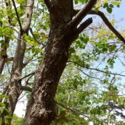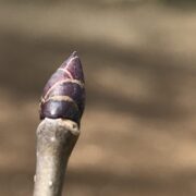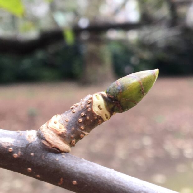 先がとがり、 きっちりと芽鱗につつまれた水滴型の冬芽です。 葉痕の維管束痕は3つで、 はっきりとしたお顔に見えます。 他の木が芽吹き始めるころ、 表情を変えずに、 まだ寒そうにかたい帽子をかぶっている子たちです。
