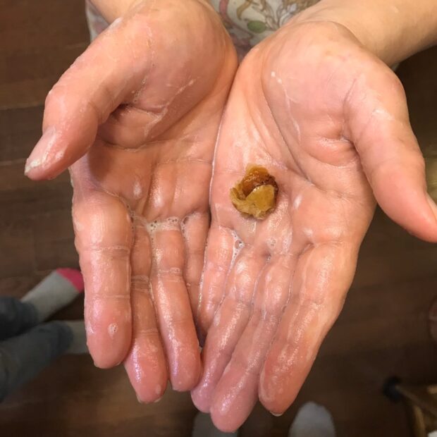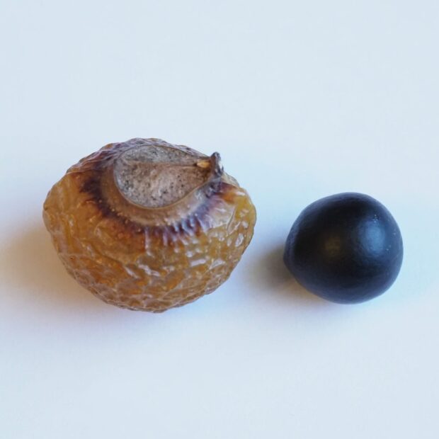 実の皮が半透明です。 この半透明の皮がせっけんのように使えます。 ペットボトルに水と一緒に入れて振ると泡立ちます。 中の黒い種が羽子板の羽の黒い部分に使われています。