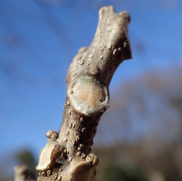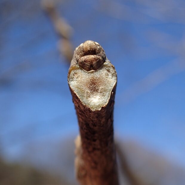 太い枝に、 小さな2つの芽がついています。 葉痕は芽よりかなり大きく、 笑っているような、 寝ているようなお顔があります。