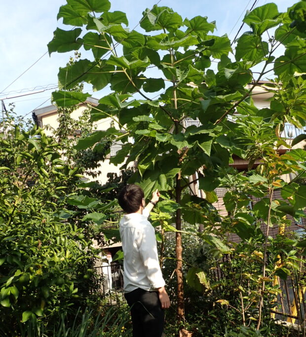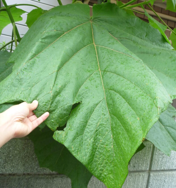 キリは中国原産の木。 キリのタンスで有名です。 木材が軽くて加工しやすくまた、 燃えにくいので金庫の中などにも使われました。 種は小さく風にのり日当たりの良い場所で大きくなります。