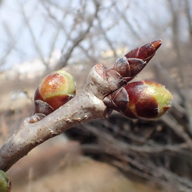褐色で艶があります。 葉芽は細めでとがり、 花芽はぷっくりと丸みがあります。 葉痕の維管束痕は3つでお顔に見えます。