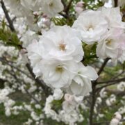 漢字では「雨宿」と書きます。 オオシマザクラの系統を受け継ぐサトザクラの仲間で、 白くて大きな「八重咲き」の花を咲かせるのが特徴です。