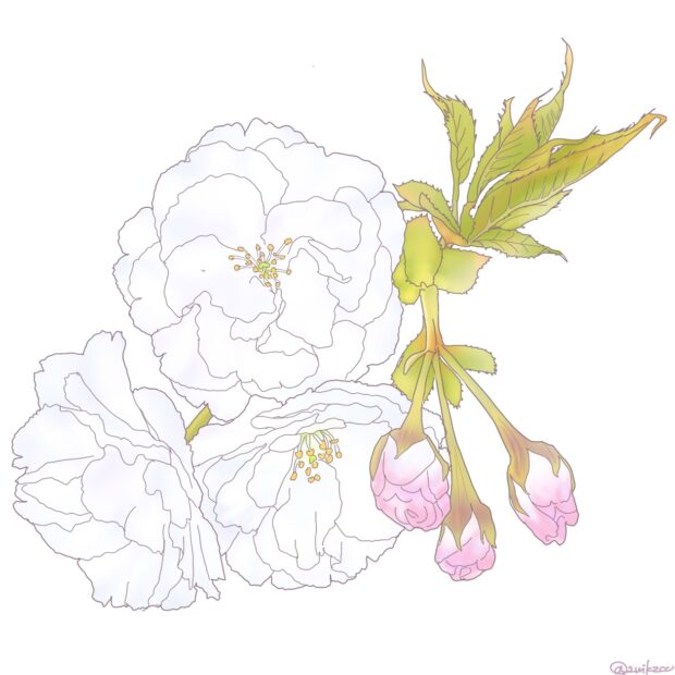 漢字では「雨宿」と書きます。 オオシマザクラの系統を受け継ぐサトザクラの仲間で、 白くて大きな「八重咲き」の花を咲かせるのが特徴です。