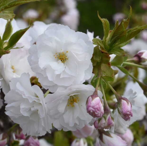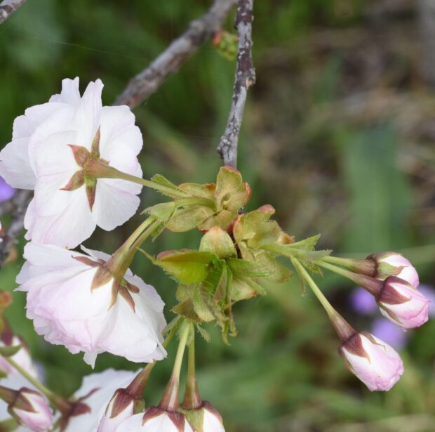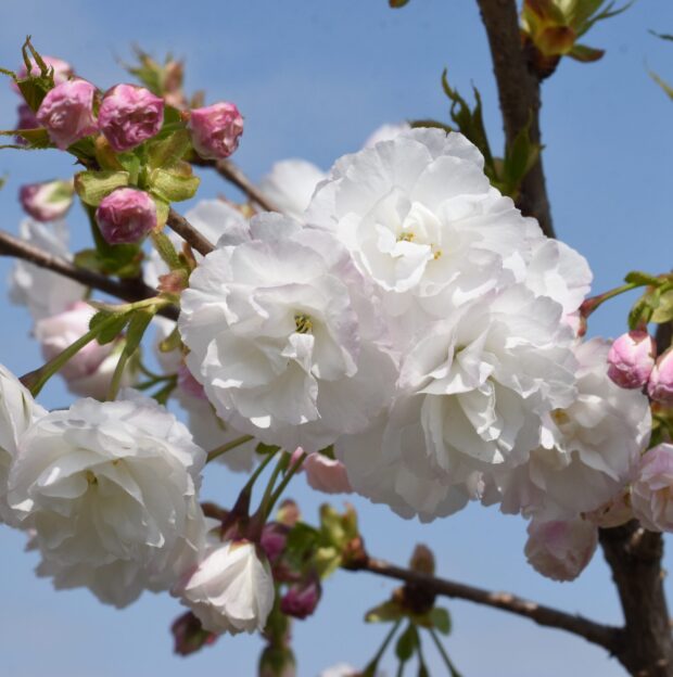 オオシマザクラ系のサトザクラで、 白く大きな八重の花を咲かせる品種には、 本種のほかに「シロタエ」があります。 どちらも非常によく似た特徴を持ちますが、 花の向きで見分けることが可能です。