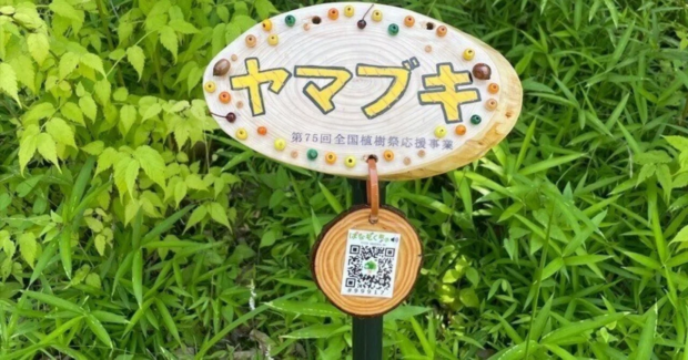 スマホで「はなもく散歩」樹名板のQRコードを読むだけで木の音声ガイドやクイズなどが楽しめます。