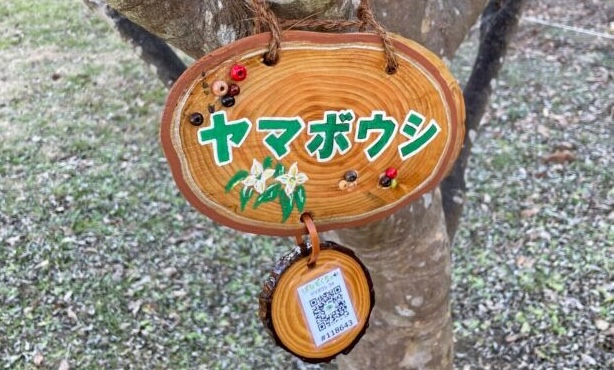 スマホで「はなもく散歩」樹名板のQRコードを読むだけで木の音声ガイドやクイズなどが楽しめます。