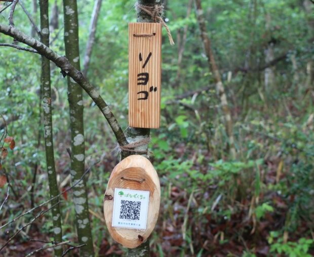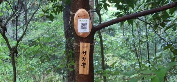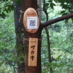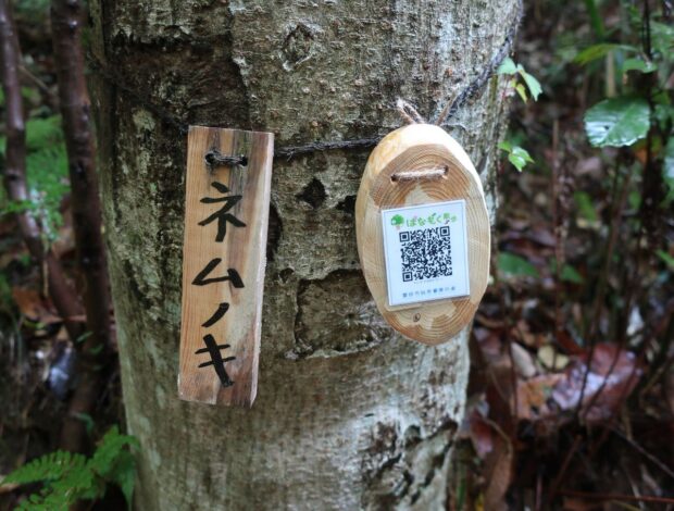スマホで「はなもく散歩」樹名板のQRコードを読むだけで木の音声ガイドやクイズなどが楽しめます。