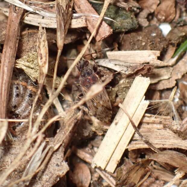ヒョウタンナガカメムシの仲間。 草地で見られ、 夜は明かりにやって来ます。 体は褐色で、 前あしの腿節が太く、 胸がくびれています。 似ている種が多く識別には注意が必要。 キベリヒョウタンナガカメムシに似ていますが、 本種は、 前ばねに直立した長毛がなく、 中あし腿節の黒い部分が広いです。