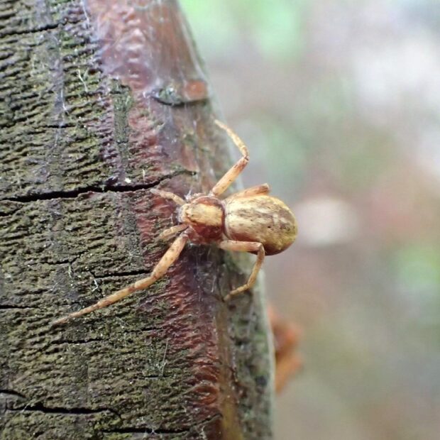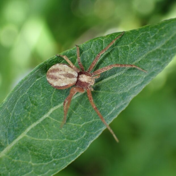 エビグモ科の仲間。 本州では山地に生息し、 草や木の葉、 枝を歩き回って獲物を探します。 体は茶色または茶褐色で、 黄金色のものも見られます。 オスの体色はグレーです。