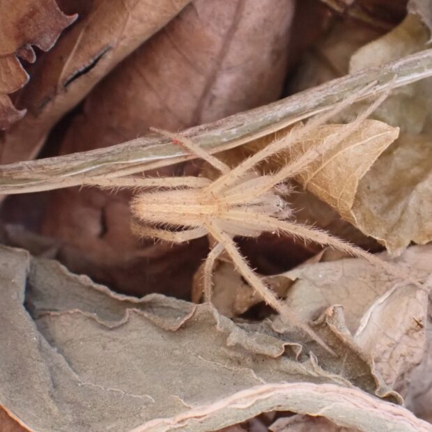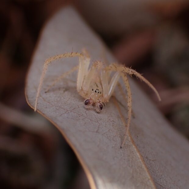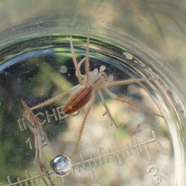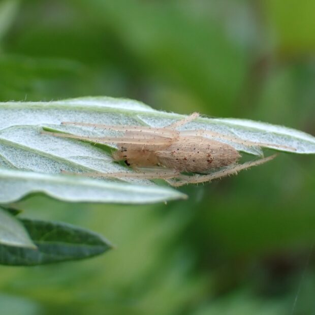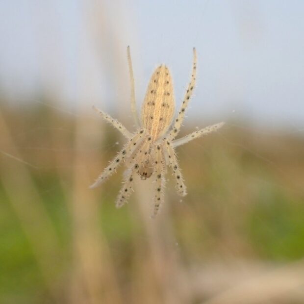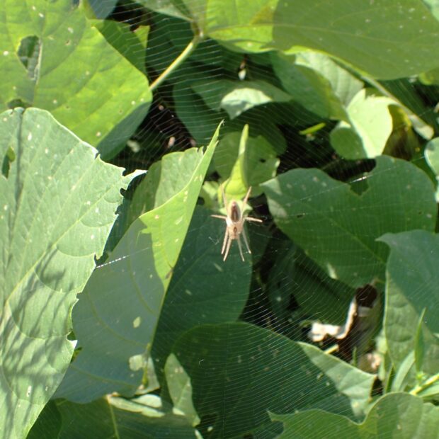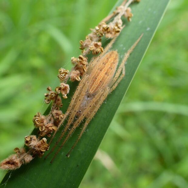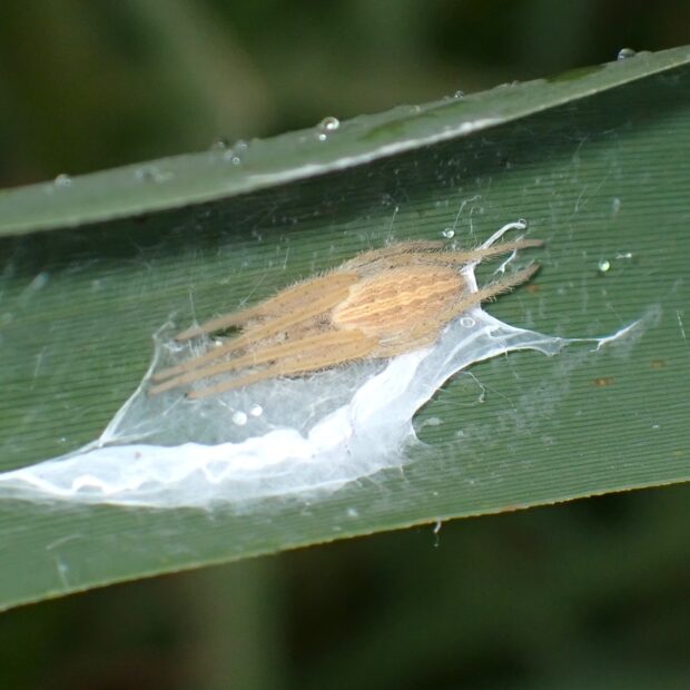 コガネグモ科の仲間。 草地、 池や川の周辺、 、 ススキ原などに生息しています。 明るい褐色の腹部に縦線があり、 毛深いです。 夕方、 草の間に垂直円網を張り、 明け方に取り壊し、 昼間は葉裏に隠れています。