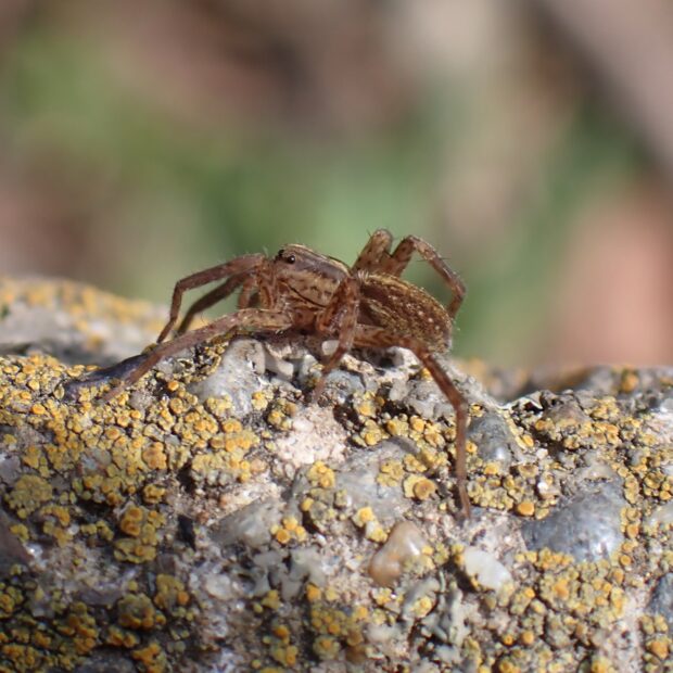 コモリグモ科の仲間。 名前のとおり、 池、 川、 田んぼ周辺の湿地で見られます。 体は茶色で、 頭胸部に黒い筋があります。 湿地を歩き回って獲物を探します。