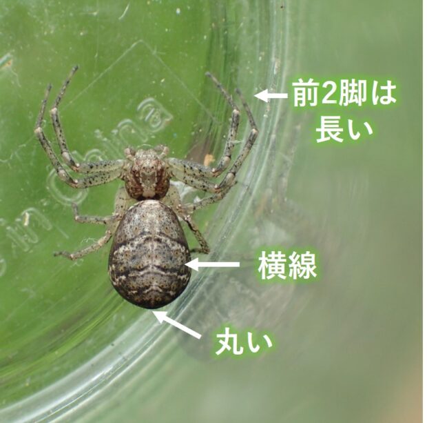 カニグモ科トラフカニグモの仲間。 平地~山地に生息し、 公園、 草地、 樹林地周辺で見られます。 草や木の葉の上で、 あしを伸ばして獲物を待ち伏せし、 主にアリを食べます。 名前は腹部後端のお尻が丸いことに由来します(似ているトラフカニグモはお尻が凹になる)。