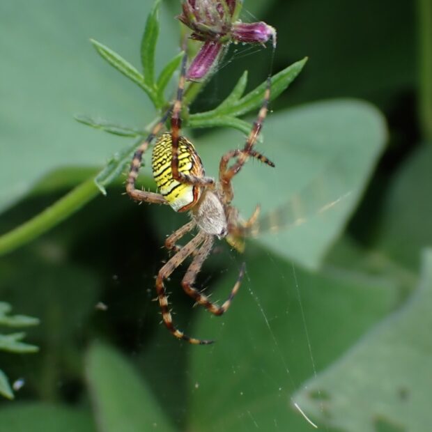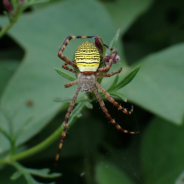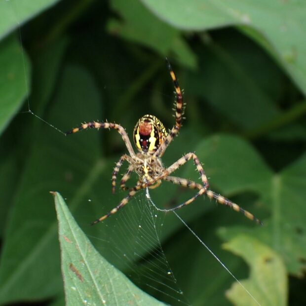 コガネグモ科の仲間。 丸みのある腹部に、 細かな横じま模様があるクモ。 南西諸島に生息し、 草地で見られます。 垂直に張った円網に、 X字状に白帯(かくれ帯ともいう)をつけ、 あしを2本ずつそろえて止まります。
