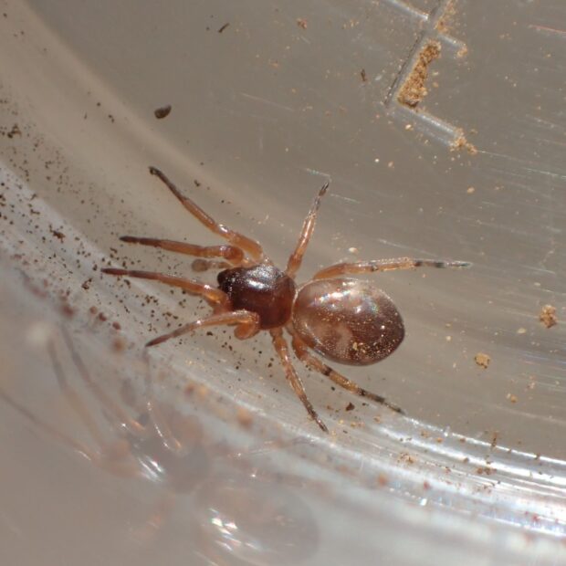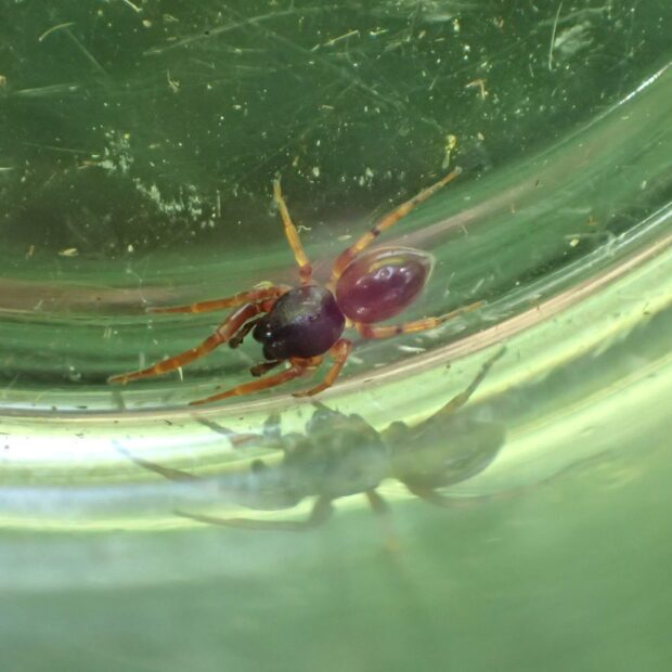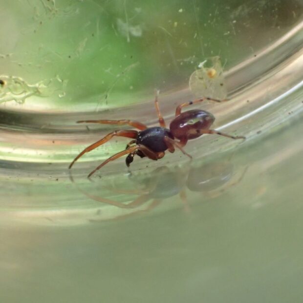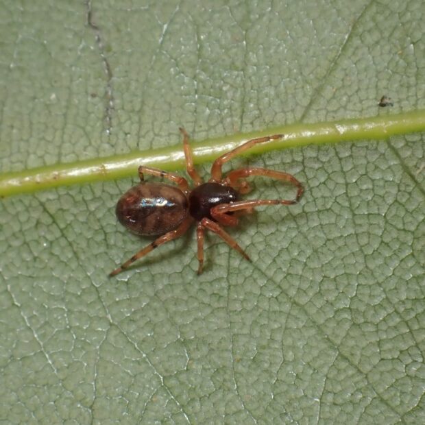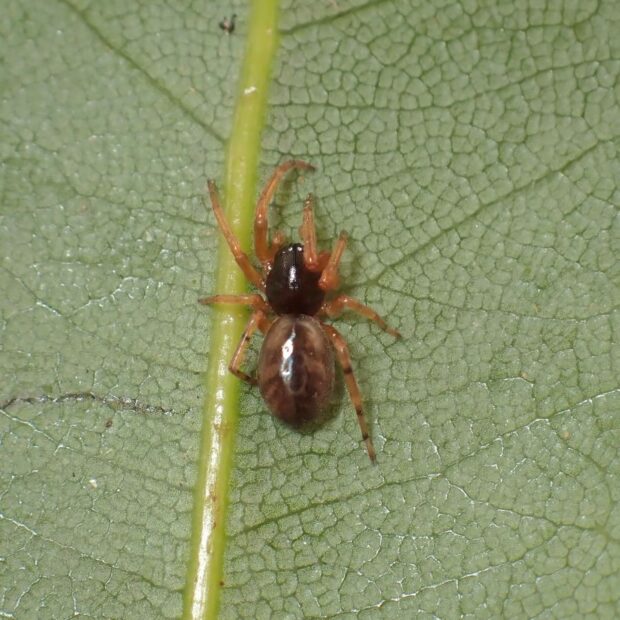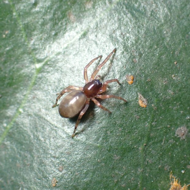 ネコグモ科の仲間。 平地~山地まで広く生息し、 公園、 草地、 樹林地などで普通に見られます。 草、 木の枝、 落ち葉などを歩き回って獲物を探します。