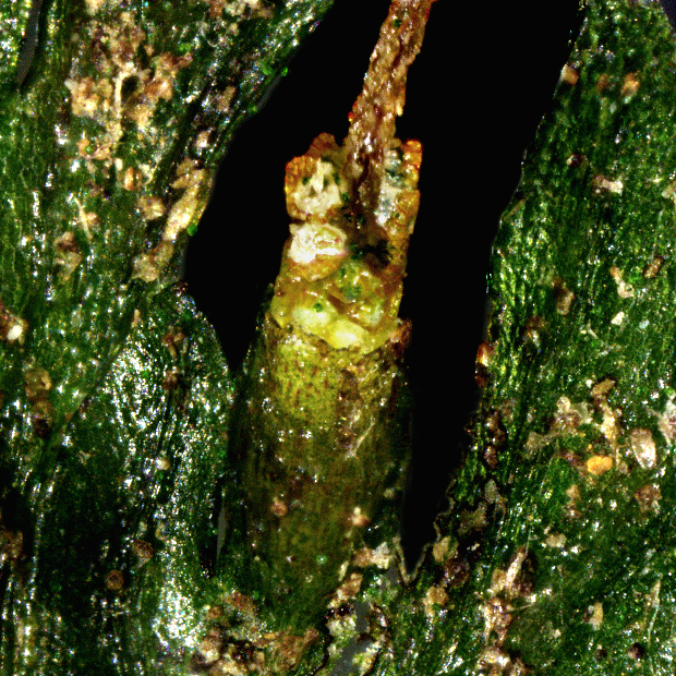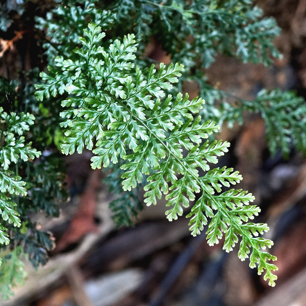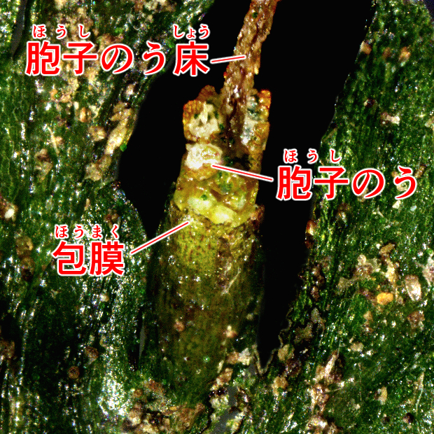 亜熱帯域に広く分布するコケシノブ科のシダ。 葉は濃緑色で硬い質感があり、 やや波打ってテカテカしています。 包膜がコップ状なところはハイホラゴケ類に似ていますが、 根茎が短いので、 葉が密に出る感じになります。