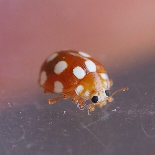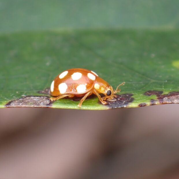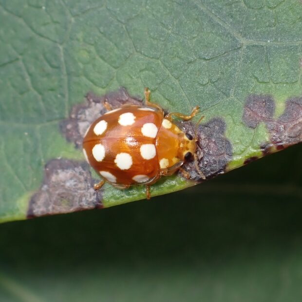 オレンジ色の上翅に白い紋が並ぶテントウムシ。 白色の紋は1-2-2-1に並びます。 シロホシテントウは、 2019年にフクダシロホシテントウとサイトウシロホシテントウの2種になりました。 他にも似ているシロホシテントウがいることから、 識別には交尾器を調べる必要があります。